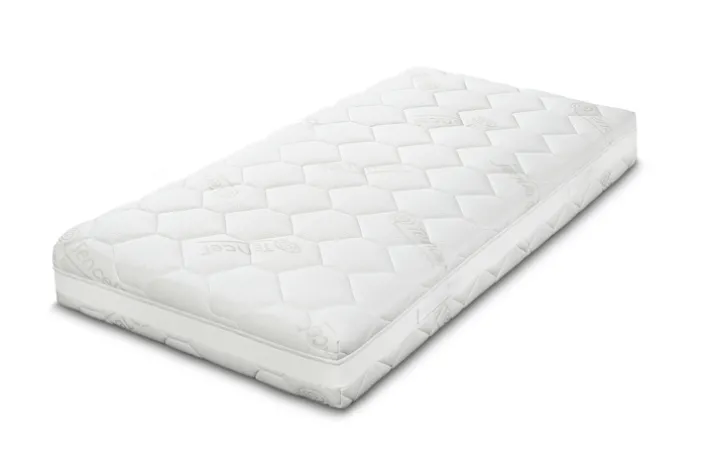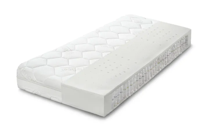 Die Matratze ist in einem eleganten Weiß gehalten und besteht aus hochwertigem Textilmaterial. Der Bezug ist mit einem praktischen Reißverschluss ausgestattet, der eine einfache Pflege ermöglicht. Der Taschenfederkern sorgt für eine gute Belüftung und unterstützt die Langlebigkeit der Matratze. Das Design zeigt ein modernes, hexagonales Muster, das nicht nur optisch ansprechend ist, sondern auch zur Struktur der Matratze beiträgt. Mit einem Gewicht von 20 kg ist sie stabil und dennoch handlich genug für eine einfache Handhabung.