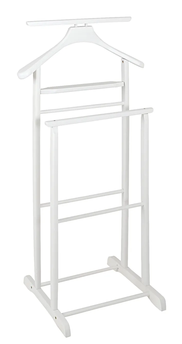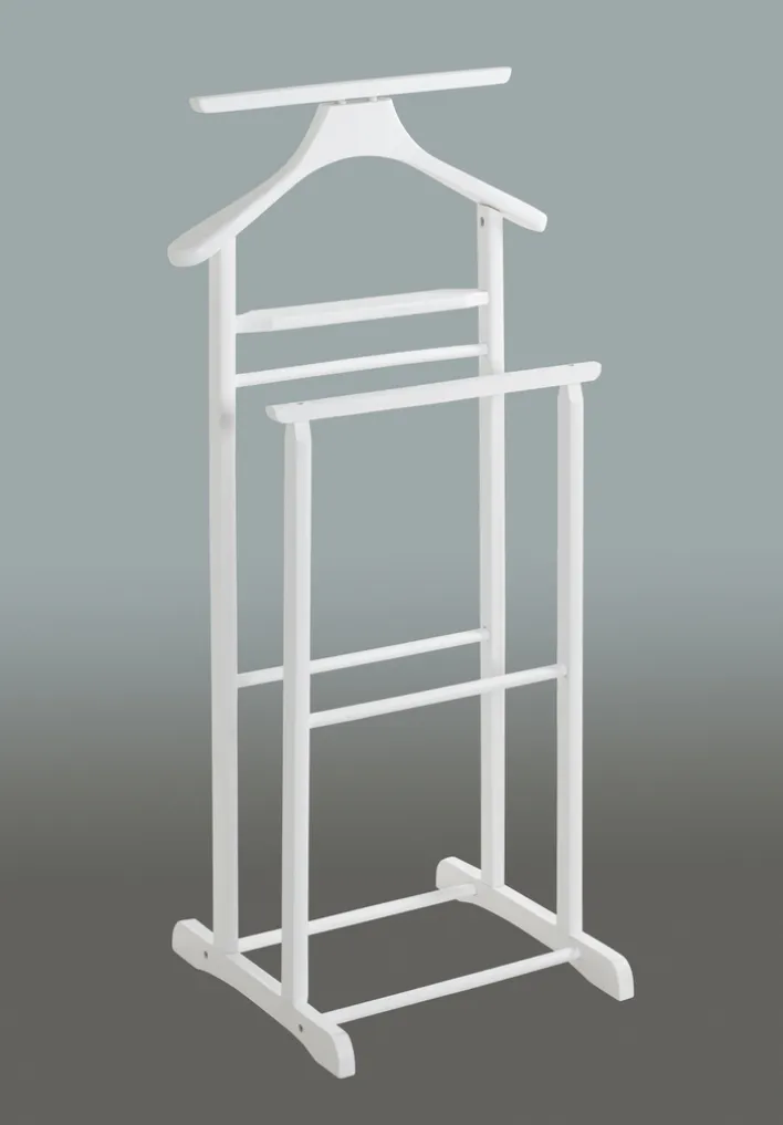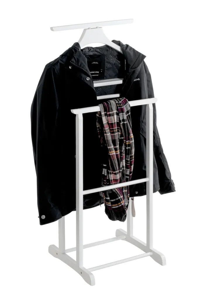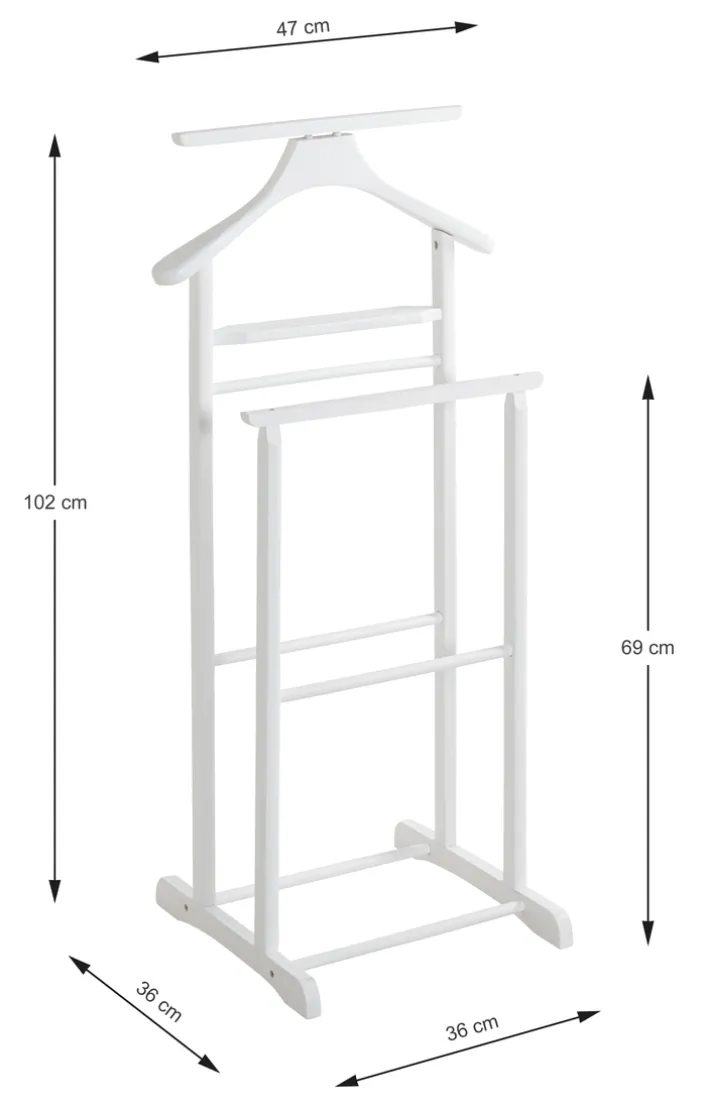 Der Herrendiener FUNNY besitzt die Maße 47 x 102 x 36 cm und präsentiert sich massiv und weiß. Er ist perfekt für Anzüge und Hemden geeignet.
