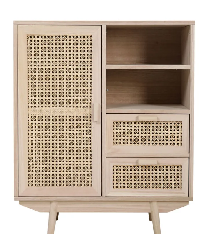 Das Highboard kombiniert Paulownia Massivholz mit furnierter Holznachbildung und Einsätzen aus Rattan-Geflecht. Mit ihrem freundlichen, natürlichen Look zaubert es eine gemütliche Atmosphäre in den Wohnraum. Schlichte, kaum auffallende Griffe perfektionieren das naturbelassene Design. Ein Highlight ist das Highboard auch durch ihren großzügigen Stauraum. In zwei Fächern und zwei Schubkästen bietet es viel Platz für Alltagsgegenstände, während die geräumige Oberfläche als Ablage dient. Für ein harmonisches Ambiente lässt sich das Highboard mit weiteren Möbeln mit Rattan-Fronten kombinieren.