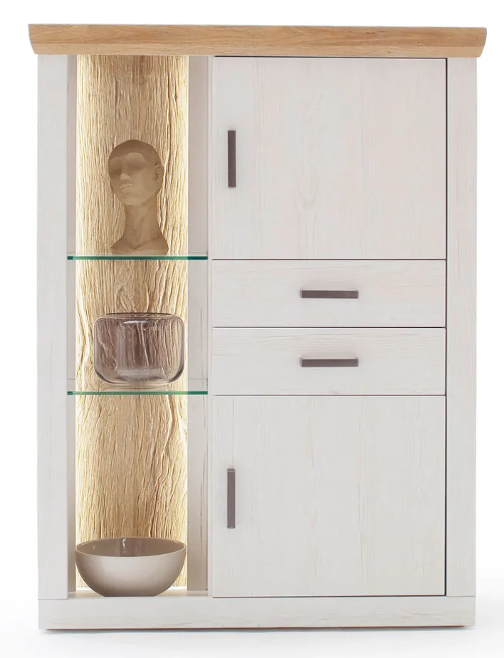 Das Material des Highboards besteht aus einer hochwertigen Holznachbildung und Klarglas, was für eine robuste und zugleich stilvolle Optik sorgt. Die Glasart ist Klarglas, das in den offenen Fächern des Highboards eingesetzt wird und eine klare Sicht auf dekorative Elemente ermöglicht. Die klaren Linien und die natürliche Holzoptik machen das Highboard zu einem zeitlosen Möbelstück, das sowohl in modernen als auch in klassischen Einrichtungen seinen Platz findet.