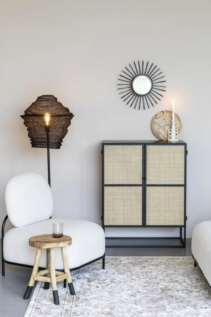 Das Highboard JOANNA kombiniert ein schwarz pulverbeschichtetes Metallgestell mit schwarz lackierter Holznachbildung und natürlichem Rattangeflecht. Es hat eine Größe von 80 x 100 x 38 cm und ist für Esszimmer sowie offene Wohn-Essbereiche geeignet. Die Drehtüren mit Magnetverschluss sorgen dafür, dass Geschirr, Gläser und vieles mehr jederzeit griffbereit und doch vor fremden Blicken geschützt sind. Ein weiterer Pluspunkt des Highboards ist die geräumige Oberfläche. Auf ihr abgestellte Zimmerpflanzen und Dekorationen werten das Raumklima auf.