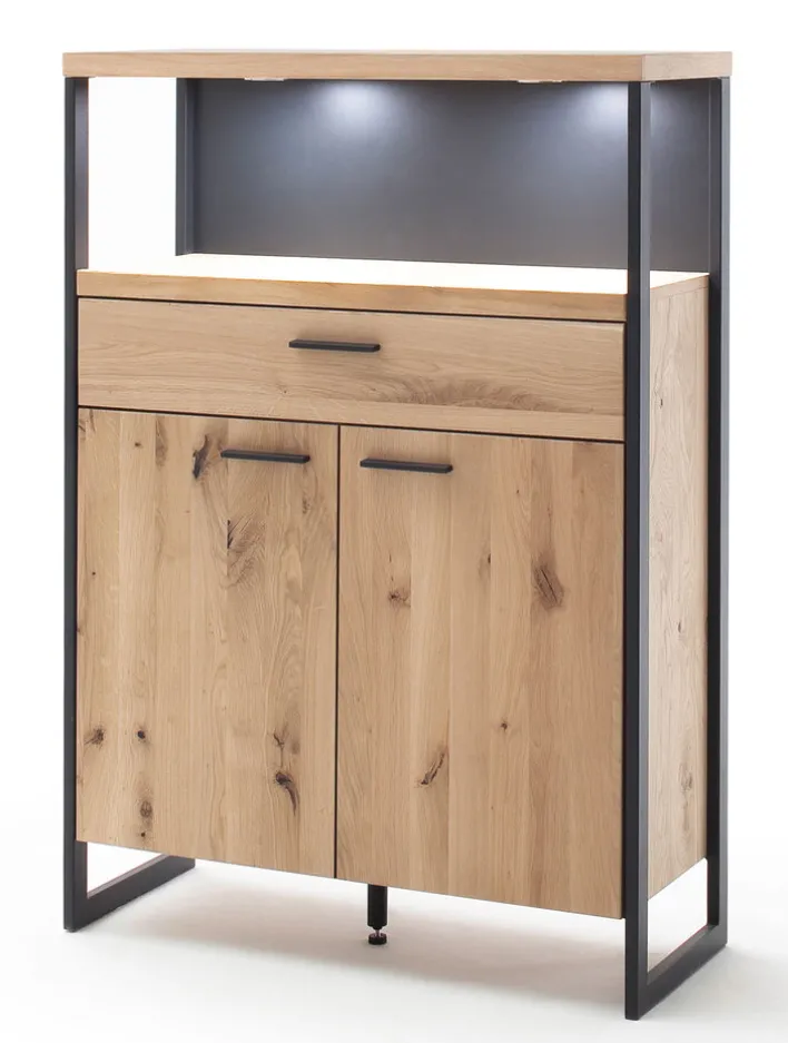 Gefertigt aus teilmassivem Eichenholz, Glas und Metall, überzeugt das Highboard durch seine hochwertige Materialauswahl. Die geölte und lackierte Oberfläche unterstreicht die natürliche Holzmaserung und sorgt für Langlebigkeit. Das Möbelstück verfügt über zwei Einlegeböden und ein offenes Fach, die vielseitige Aufbewahrungsmöglichkeiten bieten. Die klaren Linien und die dezente Beleuchtung setzen stilvolle Akzente in jedem Schlafzimmer.
