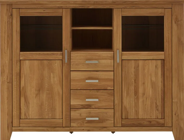 Das stilvolle, braune Highboard LOFT ist 202 cm breit und 151 cm hoch. Es besteht aus massiver, geölter Eiche und besticht durch eine sehr hochwertige und robuste Verarbeitung.