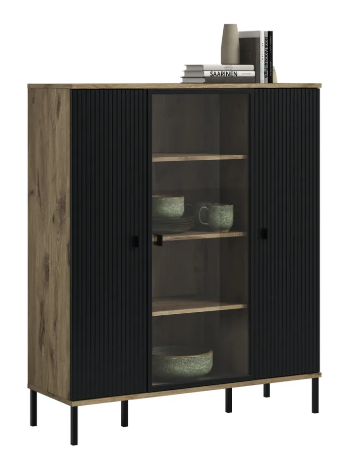 Dieses Highboard aus der Serie LOU präsentiert sich in einem modernen Design und kombiniert eine klare Linienführung mit funktionalen Elementen. Die Front ist durch drei Drehtüren unterteilt, wobei die mittlere Tür aus getöntem Pasolglas-Sicherheitsglas besteht und einen Einblick auf die dahinterliegenden Einlegeböden gewährt. Die beiden äußeren Türen sowie die Seitenteile zeigen eine vertikal gerillte Struktur in Schwarz, was dem Möbelstück eine klare, zeitgemäße Optik verleiht. Die sichtbaren Holzflächen, insbesondere Korpus, Ober- und Unterkante, sind in einer Nox Oak Nachbildung gehalten, die eine warme Eichenholz-Optik bietet und einen harmonischen Kontrast zu den schwarzen Flächen bildet. Die Griffe und das filigrane Metallgestell unterstreichen den modernen Stil, während die gesamte Konstruktion stabil und geradlinig wirkt. Das Highboard misst 115 cm in der Breite, 137 cm in der Höhe und 41 cm in der Tiefe, das Gewicht beträgt 58,5 kg. Insgesamt sind sieben Einlegeböden vorhanden, die vielseitigen Stauraum bieten. Die Türen verfügen über eine Soft-Close-Funktion, die für ein leises und materialschonendes Schließen sorgt. Das Möbelstück ist für den Wohnbereich konzipiert und eignet sich besonders zur Aufbewahrung und Präsentation im Wohnzimmer. Die Materialkombination aus Metall, Glas und Holzdekor sowie das moderne Design machen dieses Highboard zu einem funktionalen und zugleich ästhetischen Einrichtungselement.