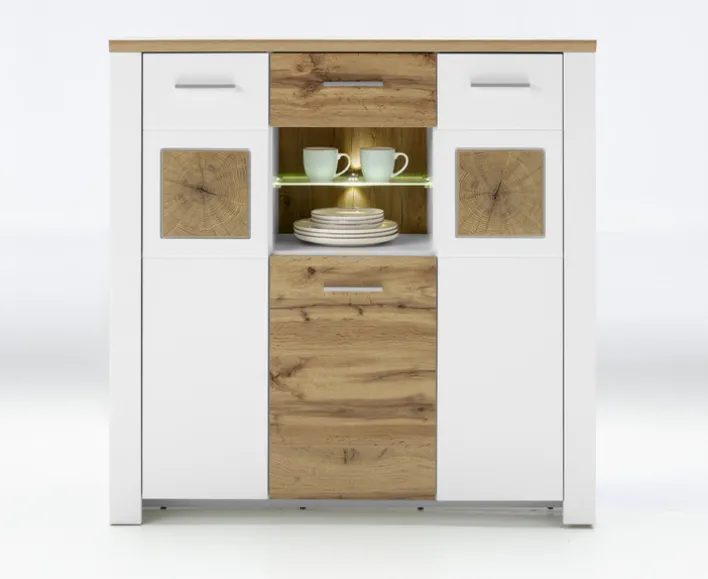 Das Highboard verfügt über drei Drehtüren, einen Schubkasten und zwei offene Fächer, die durch eine integrierte Beleuchtung akzentuiert werden. Die Griffe sind schlicht und funktional gestaltet, was die klare Linienführung des Designs unterstützt. Das Material besteht aus einer Holznachbildung und Klarglas, was die Pflegeleichtigkeit und Langlebigkeit des Möbelstücks gewährleistet. Dieses Highboard ist ideal für alle, die Wert auf stilvolle und praktische Einrichtungslösungen legen.