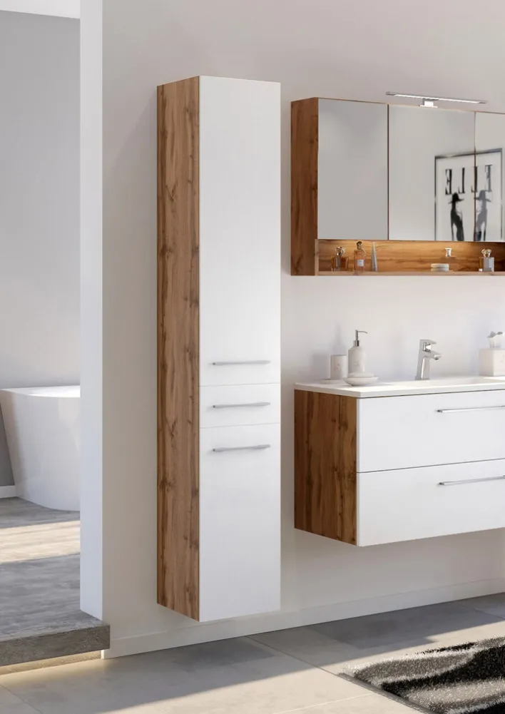 Der Hochschrank LIVORNO ist Teil der gleichnamigen Badmöbelserie, die in der schicken Farbkombination Wotan Eiche und Weiß gestaltet ist. Breite, silberfarbige Griffe ergänzen den zeitgemäßen Look. Der Schrank ist mit 2 Drehtüren ausgestattet, hinter denen sich 4 Einlegeböden verbergen. Eine Schublade macht das Raumangebot komplett.