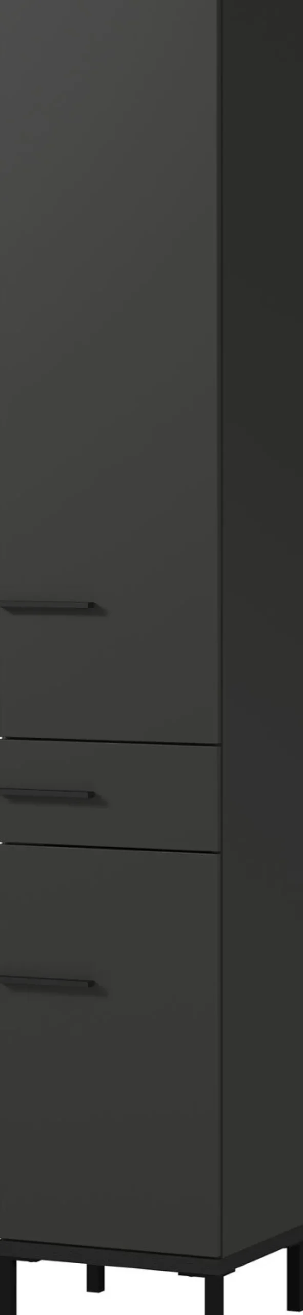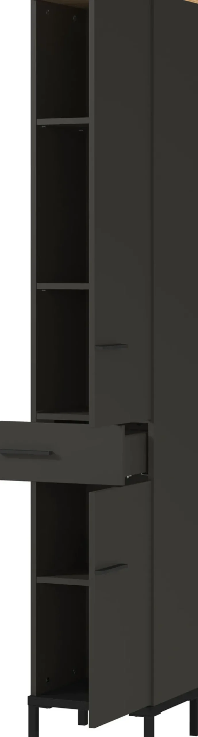 Der Hochschrank YONKERS in den Farben Graphit/ Navarra Eiche misst 34 x 190 cm. Er verleiht dem Badezimmer mit seinem modernen Look ein stylisches Ambiente und bietet zugleich viel Platz für Pflegeprodukte, Handtücher und vieles mehr.