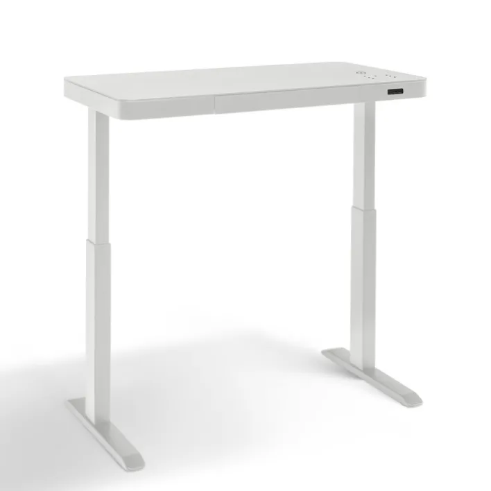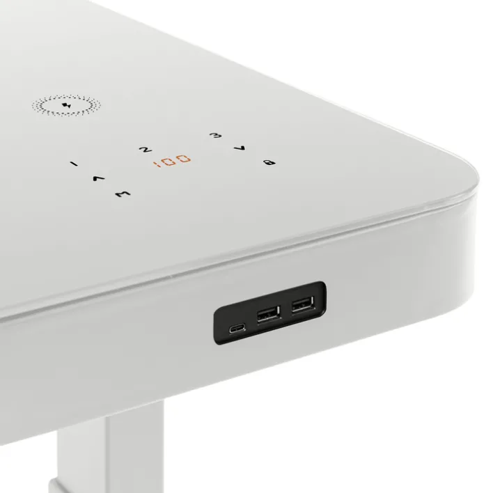 Der höhenverstellbare Schreibtisch BONMEDICO MOVU II vereint modernes Design mit praktischen Funktionen. Mit einer Breite von 120 cm und einer Tiefe von 60 cm bietet er ausreichend Platz für Ihre Arbeitsutensilien. Die Höhe lässt sich motorisch von 73 cm bis 119 cm verstellen, was eine ergonomische Anpassung an individuelle Bedürfnisse ermöglicht. Der Tisch ist in einem eleganten Weiß gehalten und besteht aus einer Kombination von Glas und Metall, wobei die Tischplatte aus Farbglas gefertigt ist.