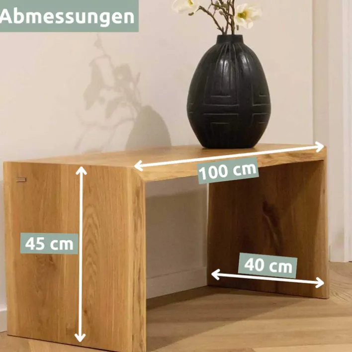 Die 100 x 45 cm große Massivholzbank ist ein Traum aus Eiche geölt und mit der wunderschönen, natürlich gewachsenen Baumkante ein sehr eleganter Blickfang. Mit einer Tiefe von 40 cm kann sie vielseitig verwendet werden.