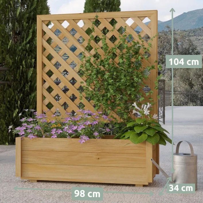 Der holz4home Pflanzkasten SPALIER misst 98 x 34 cm, er ist insgesamt 104 cm hoch und hat eine Pflanzhöhe von 28 cm. Das massive Kiefernholz ist naturfarben.