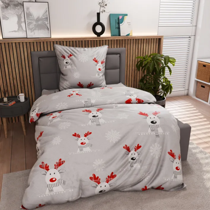 Die Bettwäsche „HIRSCHLI“ von Inspiration Home bietet eine charmante Kombination aus modernem Design und hochwertigem Material. Das Set besteht aus einem Bettbezug mit den Maßen 135 x 200 cm und einem Kissenbezug in der Größe 80 x 80 cm. Beide Teile sind aus 100 % Baumwolle gefertigt, was für ein angenehmes Schlafklima sorgt. Die Textiloberfläche aus Biber verleiht der Bettwäsche eine weiche und wärmende Haptik, ideal für kältere Nächte. Das Design der Bettwäsche ist geprägt von einem verspielten Rentiermuster in Rot und Silber auf einem grauen Hintergrund. Diese Farbkombination verleiht dem Set eine fröhliche und zugleich elegante Note. Der praktische Reißverschluss erleichtert das Beziehen und Abziehen der Bettwäsche. Mit ihrem modernen Muster fügt sich die Bettwäsche nahtlos in verschiedene Einrichtungsstile ein und setzt dabei einen stilvollen Akzent im Schlafzimmer.
