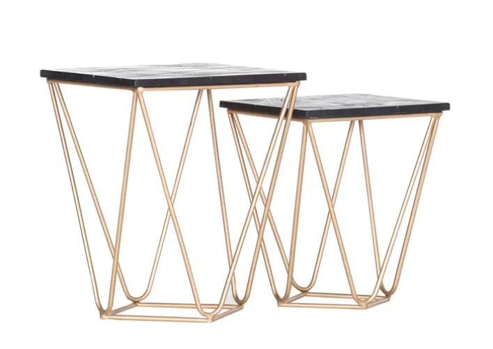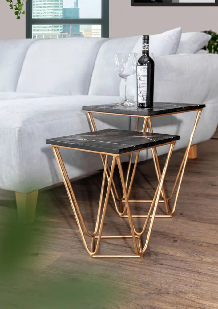 Das Beistelltisch 2er Set von INTERhome trägt zu einem schönen Wohnambiente bei. Durch ihr besonderes Design sind die Tische ein schöner Blickfang. Goldfarbig pulverbeschichtetes Metall und massives Akazienholz, das schwarz lackiert ist, sind auf ansprechende Weise kombiniert. Die Tischplatten zeigen ein asymmetrisches Muster. Die Beistelltische SCAN sind von unterschiedlicher Größe und vielseitig verwendbar. Sie bieten neben dem Sofa Abstellfläche für Getränke und Snacks, können aber auch für Deko genutzt werden.