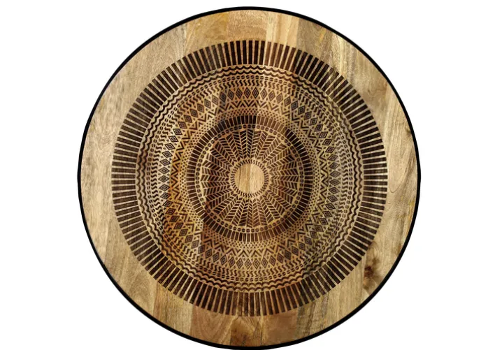 Die Tischplatte des INTERhome Couchtisch SANTA CRUZ besteht aus naturgebeiztem und lackiertem Mangoholz. Die einzigartige Lasergravur auf der Tischplatte erzählt Geschichten von Handwerkskunst und Hingabe, die jedes Stück zu einem Unikat machen. Das robuste Dreifußgestell aus pulverbeschichtetem Metall sorgt dafür, dass der Tisch auch bei intensiver Nutzung stabil bleibt.