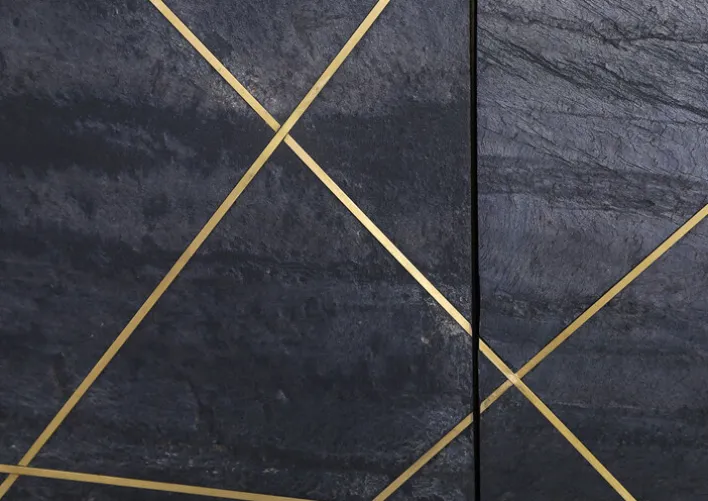 Das braun- und schwarzfarbige Sideboard LEVI mit einem Korpus aus massivem Mangoholz ist ein Allrounder für das Wohnzimmer, Esszimmer, Schlafzimmer, den Flur oder das Gästezimmer. Blickfang des 145 cm breiten, 80 cm hohen und 42 cm tiefen Sideboards sind die extravagant gemusterten Türen mit geometrischen Messingapplikationen auf einer Echtstein-furnierten Front aus MDF. Für hohe Standfestigkeit sorgt das aufwendig gestaltete Fußgestell aus Messing, das der Kommode einen leichten Vintage-Look verleiht. Das Sideboard macht als Einzelstück oder in Kombination mit anderen Möbelstücken der gleichen Serie einen hochwertigen Eindruck.