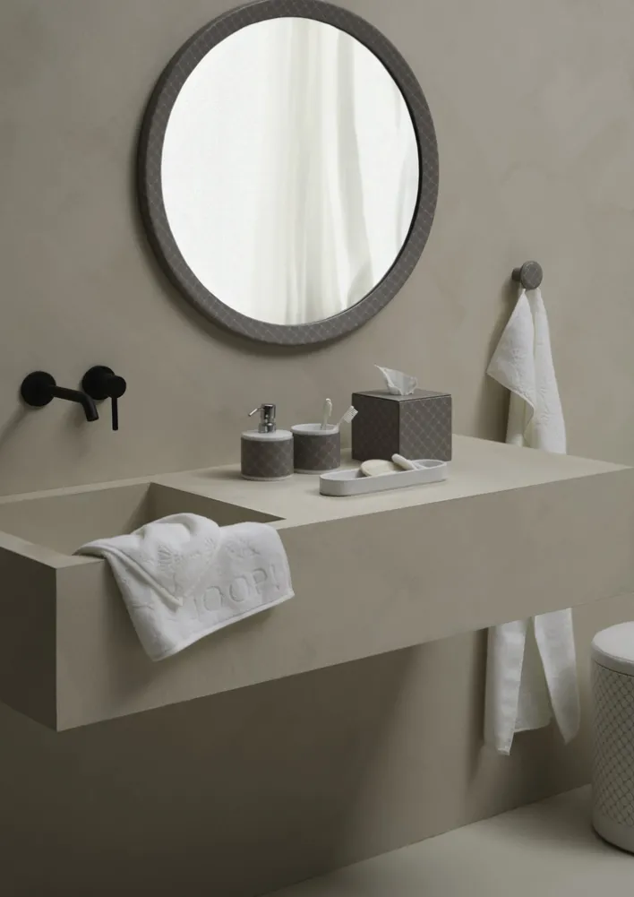 Die Farbgebung in Grau und Weiß unterstreicht den modernen Stil und macht den Becher vielseitig einsetzbar im Badezimmer. Die Kombination aus Keramik und Textil betont die hochwertige Verarbeitung und das zeitgemäße Design.