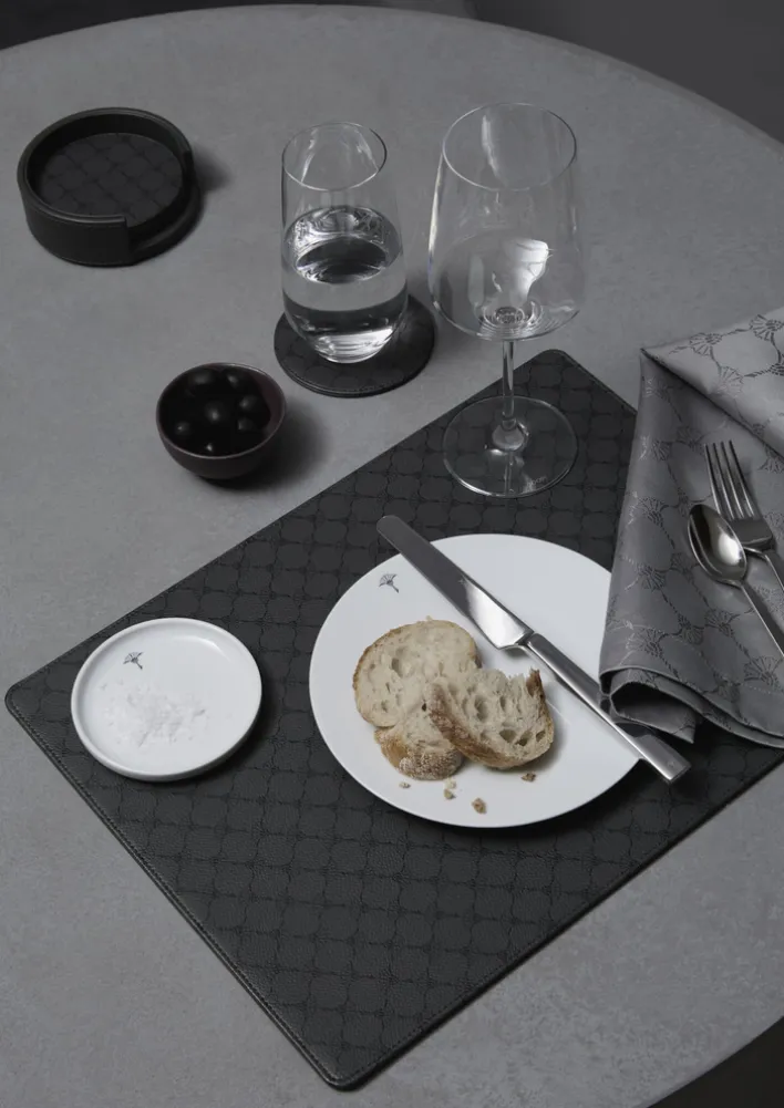 Das Design wirkt modern und zurückhaltend, wobei eine klar erkennbare Textiloberfläche aus Kunstleder die Optik prägt. Die Untersetzer sind in einem passenden Halter aus dem gleichen Material untergebracht, der für eine ordentliche Aufbewahrung sorgt. Das Material besteht aus einer Kombination von Glas und Textil. Geeignet sind die Untersetzer vor allem für Esszimmer- und Wohnzimmerbereiche.