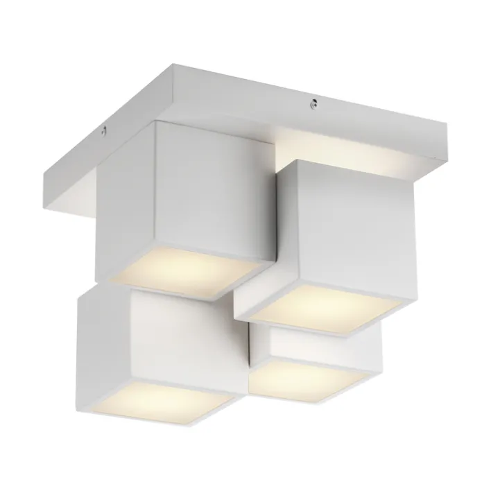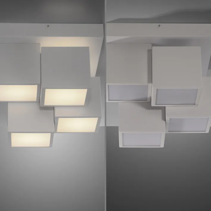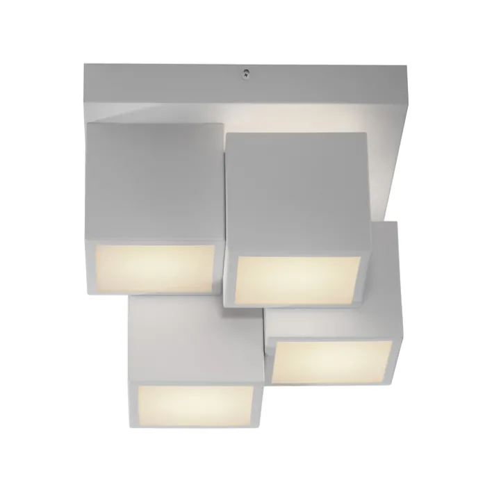 Der Schirm der LED Deckenlampe TETRIS von JUST LIGHT zeigt sich optisch in 4 miteinander verbundenen Würfel-Elementen. Über ihnen ist eine fest eingebaute LED mit einem maximalen Energieverbrauch von 17 W angebracht. Dadurch entsteht der Effekt einer indirekten Beleuchtung mit einer Lichtleistung von bis zu 1.100 Lumen in einer warmweißen Lichtfarbe von 3.000 Kelvin. Für Qualität stehen dabei nicht nur die verwendeten Metall- und Kunststoffmaterialien, sondern auch die mögliche Brenndauer der LED von bis zu 25.000 Stunden.
