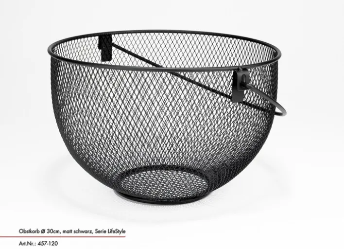 Der JUSTINUS Obstkorb besteht aus hochwertigem, pulverbeschichtetem Metall und hat die Form einer großen, runden Schale. Dank des Gitters lässt sich der Inhalt aber auch jederzeit gut von außen sehen. Außerdem wird das Obst so gut belüftet, sodass es nicht so schnell fault oder schimmelt. Der Korb ist mit einem Henkel, der sich für den Transport eignen. Außerdem kann er daran an der Decke aufgehängt werden. Somit kommt er auch für kleinere Küchen infrage.
