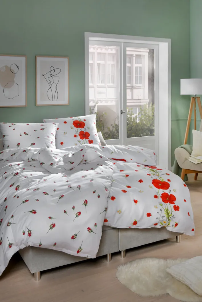 Die weiße kaeppel Bettwäsche mit dem roten Blumenprint ist optisch ganz auf Sommer eingestellt. Sie erhellt das Schlafzimmer und sorgt für eine romantische Atmosphäre im Raum. Auch mit den sommerlichen Eigenschaften des leichten Stoffes in Seersucker-Qualität kann die Bettwäsche RED POPPY überzeugen.