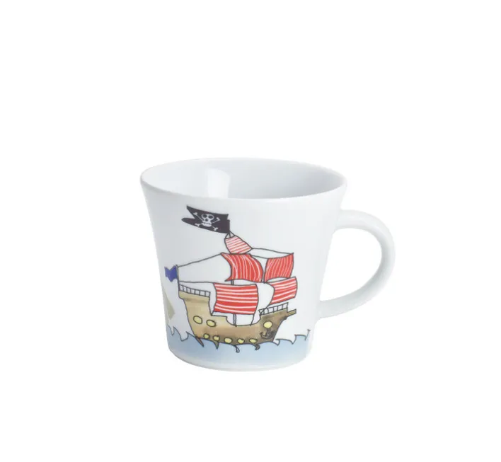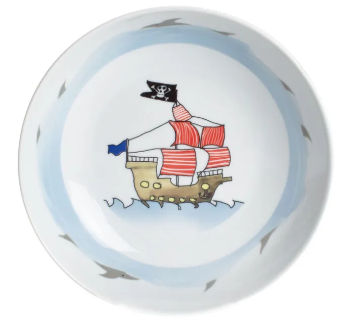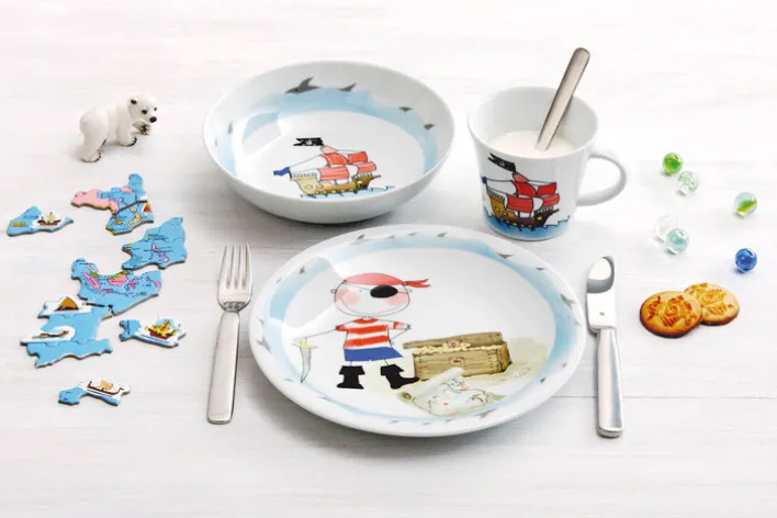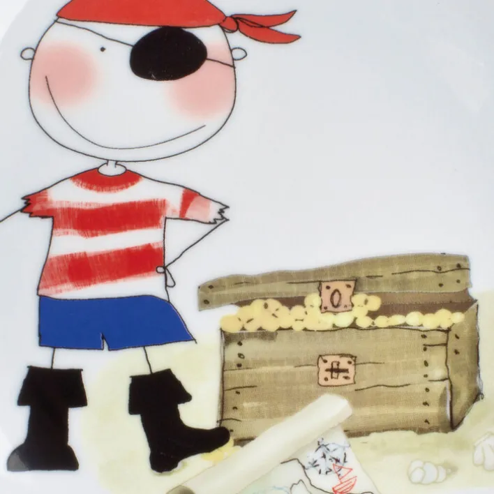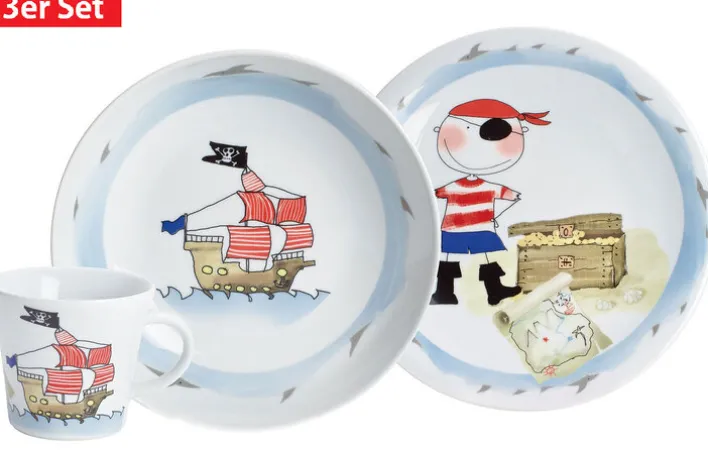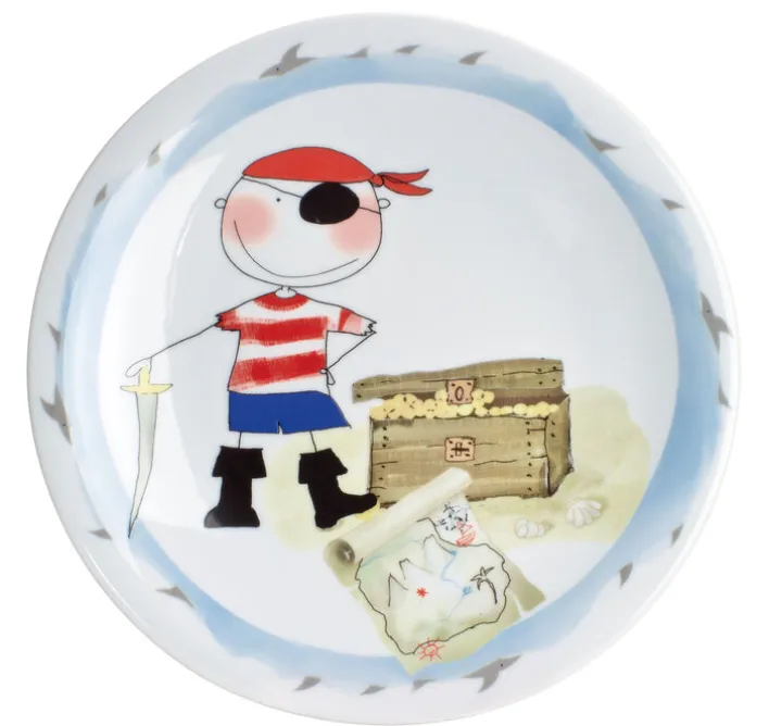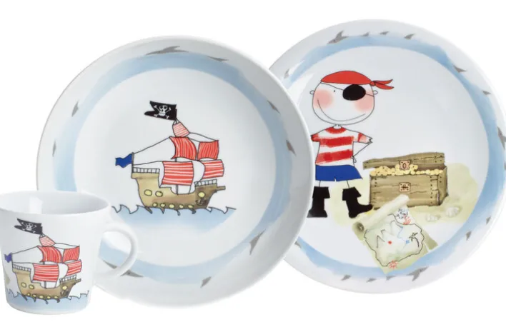 Zu diesem abenteuerlichen Kindergedeck SCHATZPIRAT aus Porzellan gehört eine Tasse, ein tiefer Teller und ein flacher Teller.