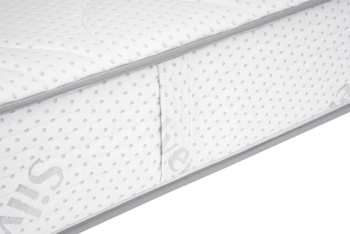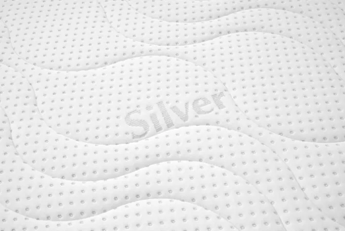 Diese Kaltschaummatratze in der Größe 180 x 200 cm bietet eine großzügige Liegefläche und eignet sich besonders für den Einsatz im Schlafzimmer. Die Matratze ist weiß und verfügt über eine feine, punktuelle Oberflächenstruktur mit dezentem Muster, das für eine optisch ruhige und gepflegte Ausstrahlung sorgt. Die Kanten sind mit einem grauen Band eingefasst, das für zusätzliche Formstabilität und eine klare Linienführung sorgt. Das Material besteht aus einem synthetischen Textilbezug mit einem Anteil von 72 % Polyester und 28 % Viskose. Die Oberfläche ist mit dem Schriftzug ‚Silver‘ gemustert und zeigt eine regelmäßige Steppung in Wellenform, die das Erscheinungsbild auflockert und die Atmungsaktivität unterstützt.