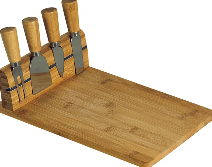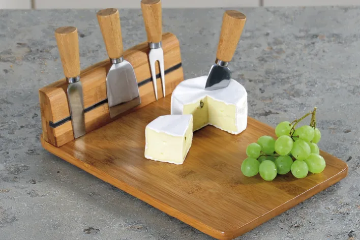 Das Set beinhaltet zudem vier Käsemesser, die in einem integrierten Messerhalter aus Bambus sicher aufbewahrt werden. Die Griffe der Messer sind ebenfalls aus Holz gefertigt, was das einheitliche Design des Sets unterstreicht. Die Kombination aus hochwertigem Bambus und robustem Edelstahl macht dieses Schneidebrett zu einem langlebigen Begleiter in der Küche. Ideal für den täglichen Gebrauch, vereint es Funktionalität mit einem ansprechenden Design.