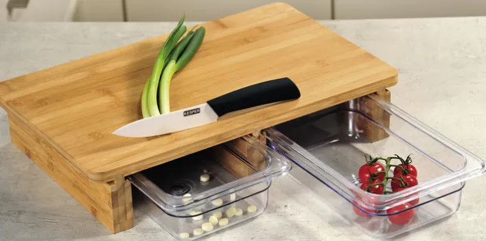 Das Schneidebrett von Kesper ist eine praktische und stilvolle Ergänzung für jede Küche. Mit einer Breite von 14 cm, einer Höhe von 31,5 cm und einer Länge von 47 cm bietet es ausreichend Platz für die Zubereitung von Speisen. Das Brett besteht aus einer Holznachbildung mit Bambusoptik, die nicht nur robust, sondern auch ästhetisch ansprechend ist. Die Hauptfarbe Braun verleiht dem Schneidebrett eine natürliche und warme Ausstrahlung, die sich harmonisch in verschiedene Küchendesigns einfügt. Besonders hervorzuheben sind die zwei integrierten Kunststoffbehälter, die unter dem Schneidebrett platziert sind. Diese bieten eine praktische Lösung zur Aufbewahrung von geschnittenen Zutaten oder Abfällen, was die Effizienz in der Küche erhöht. Die Behälter sind leicht zugänglich und können bei Bedarf einfach herausgezogen werden. Das Schneidebrett kombiniert Funktionalität mit einem modernen Design und ist ideal für den täglichen Gebrauch in der Küche geeignet.