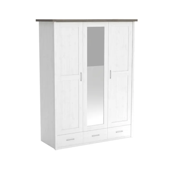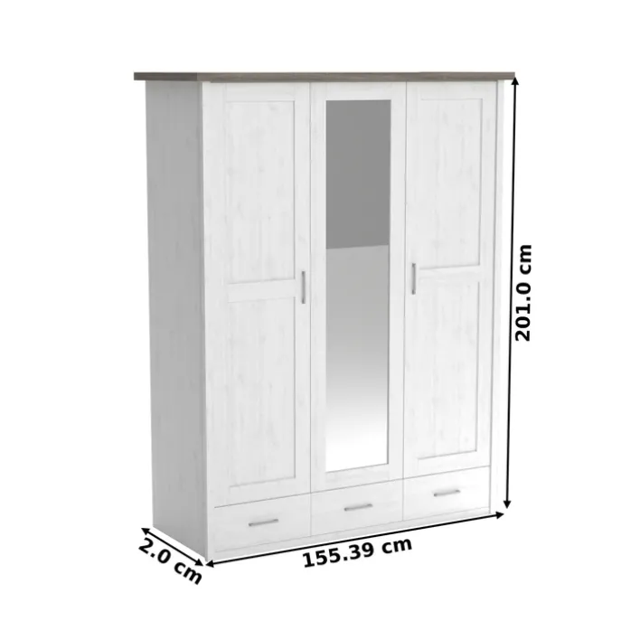 Der Schrank besteht aus einer Holznachbildung und Spiegelglas, was ihn robust und pflegeleicht macht. Im Inneren befinden sich eine Kleiderstange, drei Schubkästen und fünf Einlegeböden, die eine flexible Aufbewahrung ermöglichen. Die Dekorfarbe in Pinie unterstreicht den natürlichen Charme des Schranks. Dieses Möbelstück ist ideal für Familien, die Wert auf eine harmonische und funktionale Einrichtung legen.