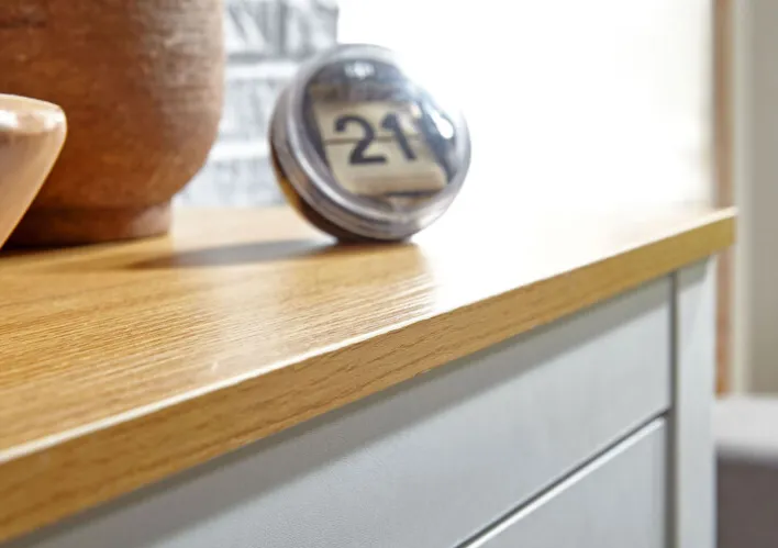 Farbe: WeißMaterial: HolznachbildungKunststoffOberflächenbeschichtung: foliertHolzwerkstoffart: SpanplatteKunststoffart 1: Melaminharz
