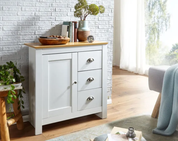 Die Kommode besteht aus solider Holznachbildung in Weiß und zieht dank braun abgesetzter Oberplatte und antik wirkenden Griffen alle Blicke auf sich. Beschichtet mit Melaminharz, sind die Oberflächen für die tägliche Beanspruchung ausgerichtet. Doch nicht nur in Sachen Qualität und Optik überzeugt die Kommode. In drei Schubkästen sowie hinter einer Drehtür bietet sie zudem jede Menge Stauraum. Für ein harmonisches Ambiente empfiehlt es sich, die Kommode mit weiteren Möbelstücken der Serie zu kombinieren.