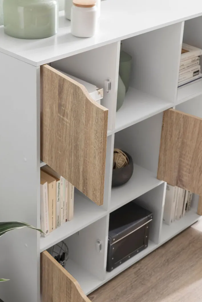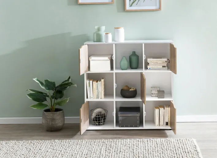 Die Kommode ist 89 cm breit, 91 cm hoch sowie 29 cm breit. Sie ist eine gelungene Kombination aus vier offenen und fünf mit Drehtür versehenen Fächern. Der Korpus ist in Weiß gehalten, die Drehtüren in einem helleren Braunton.