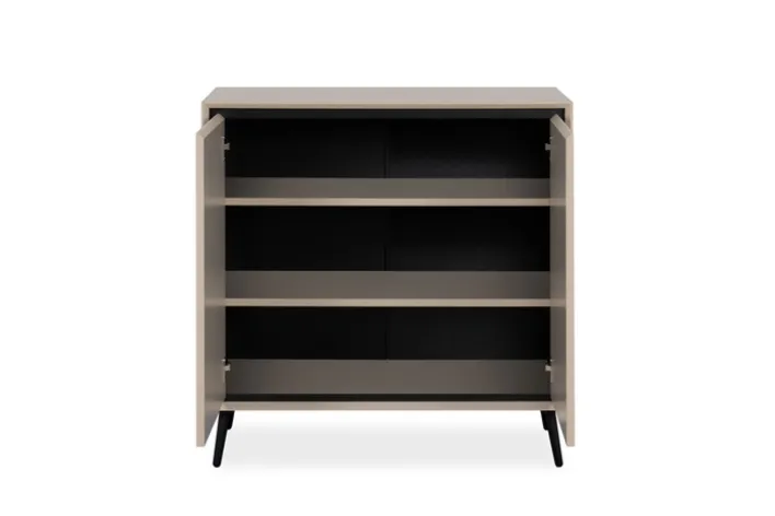 Die Hauptfarbe Beige, kombiniert mit schwarzen Akzenten, verleiht der Kommode eine elegante und zeitlose Optik. Die sandfarbene Oberfläche ist melaminbeschichtet, was für eine pflegeleichte und langlebige Nutzung sorgt.