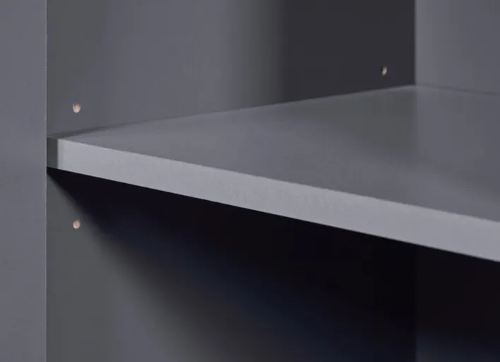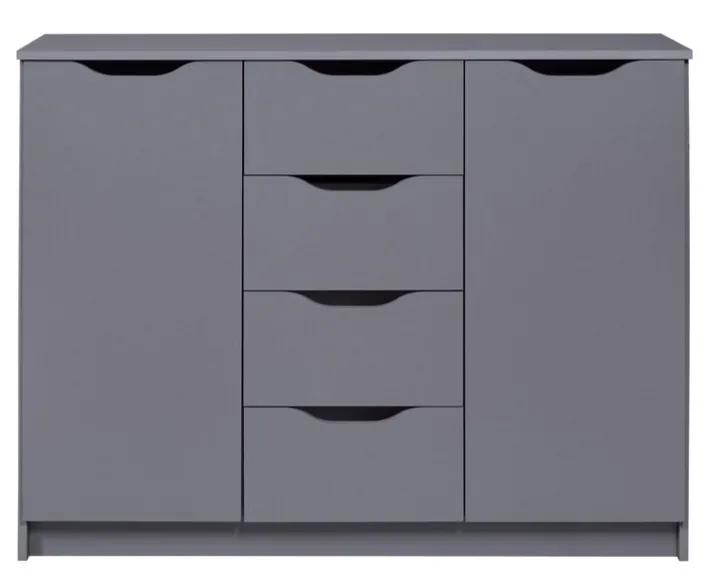Die Kommode LION ist aus graphitgrauer Holznachbildung gefertigt. Ihre dekorativen Grifföffnungen verleihen der Front eine wohnliche und harmonische Atmosphäre. Die Kommode ist Teil einer umfangreichen Serie von Aufbewahrungsmöbeln gleichen Namens. Sie kann mit diversen Elementen in verschiedenen Größen und Formen kombiniert werden.