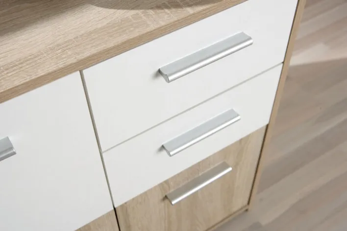 Die Kommode MARLON misst 77 x 77 x 30 cm und besteht aus solider Holznachbildung. Mit einer Farbkombination von Weiß und Eiche Dekor besitzt das Möbelstück einen natürlichen Charme und wirkt dennoch top modern. Die Kommode ist mit drei Drehtüren und zwei Schubkästen ausgestattet. Diese bieten jede Menge Platz für Alltagsgegenstände und sorgen für eine blick- und staubgeschützte Aufbewahrung. Doch damit nicht genug: Mit ihrer warmen Holzfarbe verleiht die Kommode jedem Wohnraum ein gemütliches Ambiente.