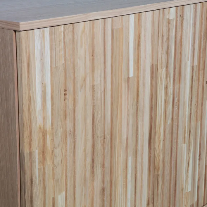Die breite Kommode mit schwarzen Füßen verbirgt hinter vier Drehtüren insgesamt acht Fächer, in denen viele Gegenstände Platz haben. Auf der Kommode sehen Dekorationsobjekte und Bücher gut aus. Das 64 Kilogramm wiegende Modell ist grifflos und begeistert mit der Push-to-open Technologie. Die im Innenbereich verwendeten Spanplatten sind in der Farbe Nebelgrau gestaltet. Das Muster der vier Türen fasziniert mit einem grafischen Relief.