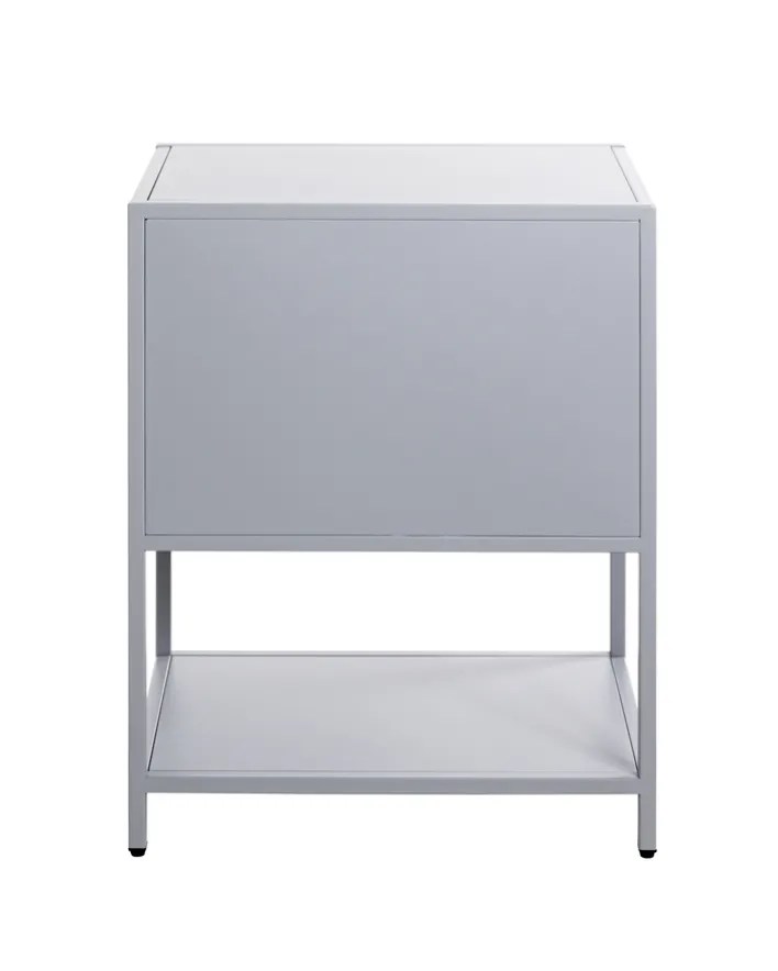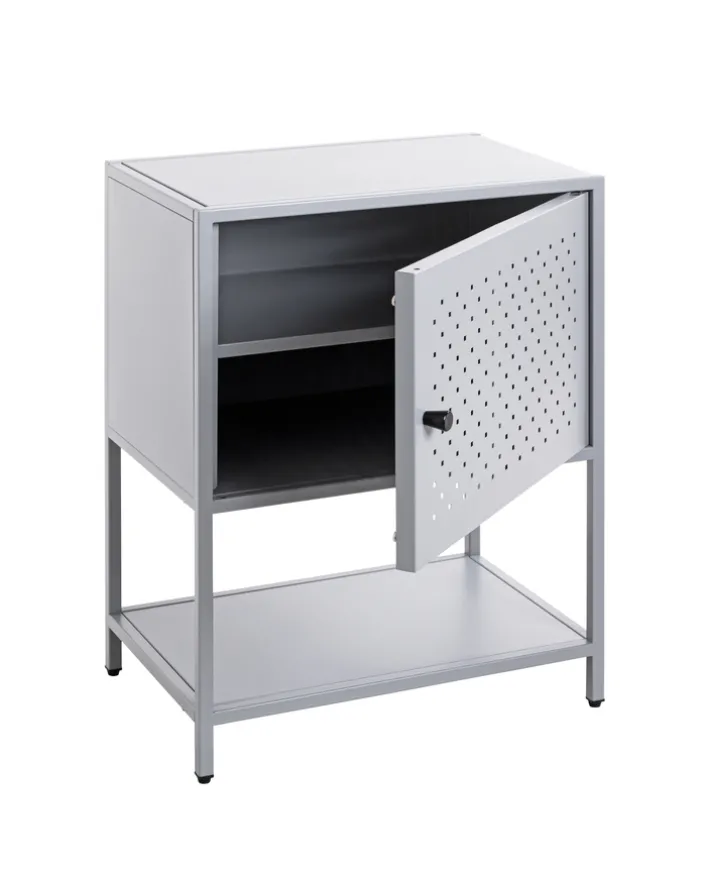 Die Konsole in der Farbe Silbergrau hat einen industriellen Charme und passt in das modern eingerichtete Schlafzimmer. Durch das tolle Design ist die formschöne Konsole mit den Maßen 45 x 30 cm ein Blickfang. Neben einem Polsterbett kommt sie besonders gut zur Geltung und bietet viel Platz und Stauraum. Die Oberplatte und die Ablage sind ideal für Zeitschriften, Wecker und eine Leuchte. Hinter der Drehtür befindet sich zusätzlicher Platz, der mit einem Fachboden unterteilt ist. Die Konsole schafft ein wohnliches Ambiente.