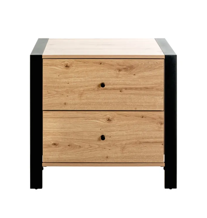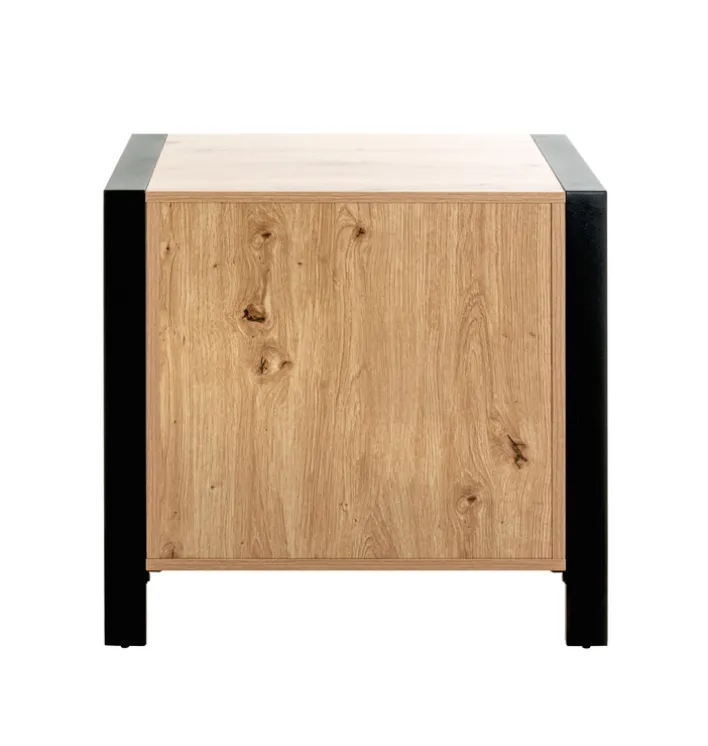 Die 60 x 42 cm große Konsole in Braun/Schwarz kombiniert helle Hölzer mit einem schwarzen Rahmen – und beweist damit Mut für Kontraste. Die Eiche-Dekor fängt den Blick mit einer liebevollen, sehr detaillierten Maserung ein, die lediglich durch die kleinen schwarzen Griffe unterbrochen wird. Währenddessen geht der schwarze Rahmen nahtlos in die Standfüße über.