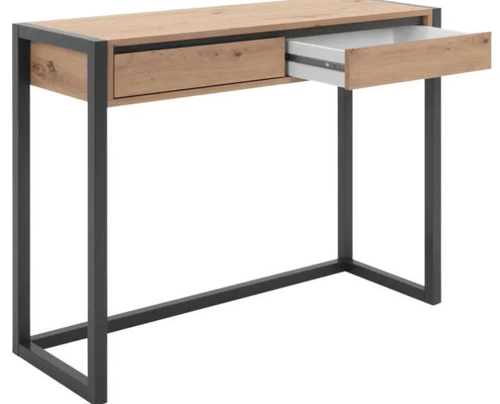 Die Konsole DENVER strahlt mit einem luftigen Gestell Leichtigkeit und Eleganz aus. Die Kombination aus den kantigen, anthrazitfarbigen Beinen und dem warmen Holzdekor wirkt wohnlich und gemütlich. Das 100 cm breite und 35 cm tiefe Möbelstück passt gut in eine große Diele, kommt aber auch in Wohn- oder Schlafzimmer gut zur Geltung.
