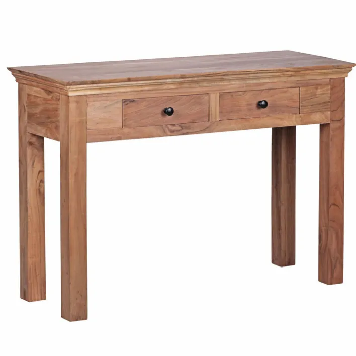 Der formschöne Konsolentisch mit den Maßen 110 x 76 cm ist eine Bereicherung für den modern oder klassisch eingerichteten Wohnbereich. Durch das stilvolle Design ist der Tisch aus Akazie in der Farbe Braun ideal für Wohnzimmer, Esszimmer oder die Diele. Zwei Schubkästen bieten viel Platz für diverse Kleinteile, Schlüssel oder Wohnaccessoires. Die Oberplatte des eleganten Konsolentischs ist als Ablage verwendbar und lässt viel Raum für verschiedene Dekorationsideen.