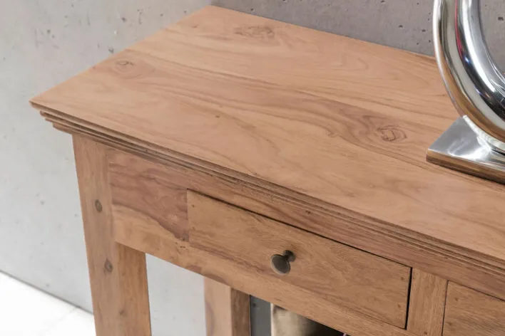 Der Konsolentisch ist aus hochwertig verarbeitetem Massivholz hergestellt. Die fein gemaserten Oberflächen und Kanten des Tischs sind gebeizt. Die runden Knopfgriffe an den Fronten der Schubkästen bestehen aus Metall und sind lackiert. Der Konsolentisch schafft ein gemütliches Ambiente.