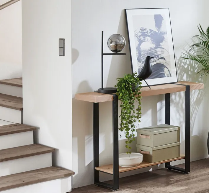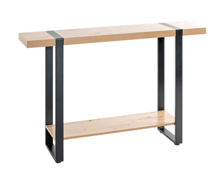 Der praktische Konsolentisch ist 120 cm breit, 30 cm tief und 82 cm hoch. Er verfügt über ein schwarzes Metallgestell und zwei eichefarbene Platten aus Holznachbildung.