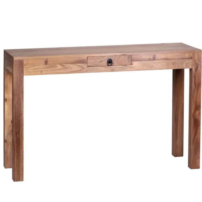 Der in brauner Akazie gehaltene Konsolentisch, der die Maße 120 x 70 cm aufweist, ist ein optisch ansprechendes Möbel, das allerdings ebenso funktional zu überzeugen vermag.