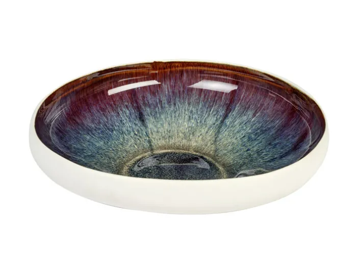 Die Dekoschale TAKEO aus feiner Keramik ist elegant und dennoch alltagstauglich. Auf dem gedeckten Tisch ist sie hervorragend zum Servieren von Salaten und Beilagen geeignet. Im Wohnzimmer oder Schlafzimmer ist die Schale ein schönes Dekorationsobjekt, in dem sich allerlei Gegenstände aufbewahren lassen. Außen ist sie mit einer feinen Mattglasur versehen, die toll mit der aufregend gefärbten Reaktivglasur im Inneren kontrastiert.
