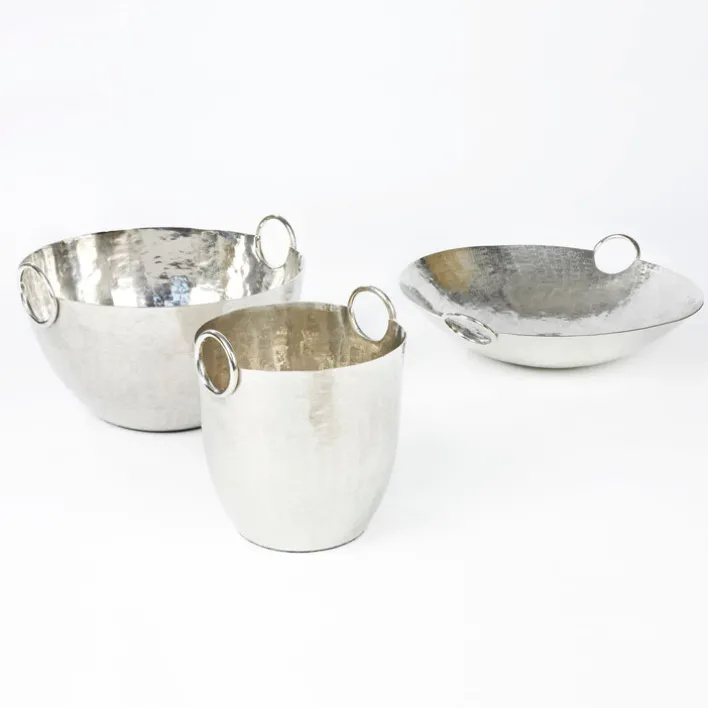 Der Weinkühler ist aus leichtem Aluminium in seine Form getrieben. In den Rand sind zwei Ringe eingelassen. Die unregelmäßigen Oberflächen sind innen und außen vernickelt und haben einen leicht matten Glanz.