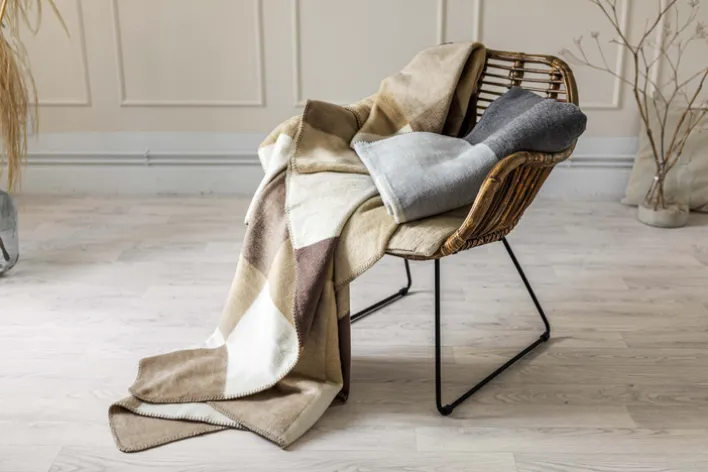 Wohndecke ROBIN zeigt sich hier in drei starken Farben, die perfekt miteinander harmonieren und eine behagliche Ausstrahlung besitzen: Ecru, Sand und Stein. Das Karomuster verleiht dem Design eine moderne und frische Optik.