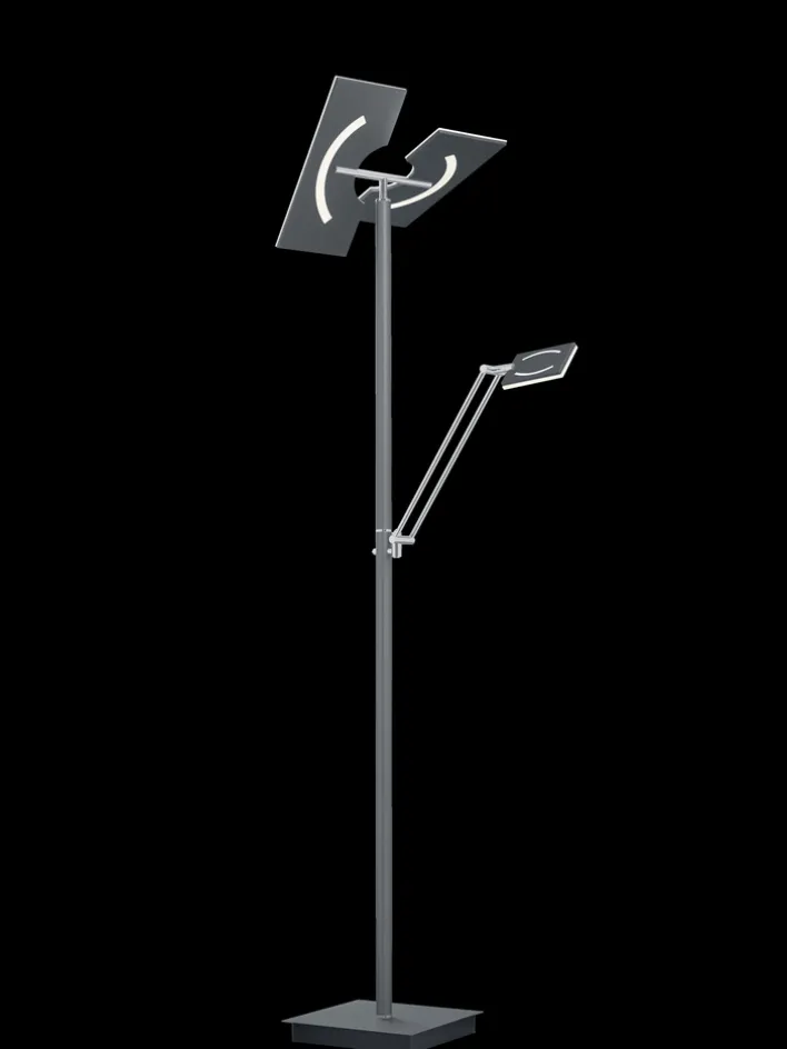 Die Stehleuchte MATEO vereint modernes Design mit hoher Funktionalität. Mit einer Höhe von 182 cm bietet sie eine beeindruckende Präsenz in jedem Raum. Die Hauptfarbe der Leuchte ist Grau, ergänzt durch chromfarbene und schwarze Akzente, die ihr ein elegantes und zeitgemäßes Aussehen verleihen. Die quadratische Form des Sockels sorgt für Stabilität und fügt sich nahtlos in moderne Wohnräume ein.