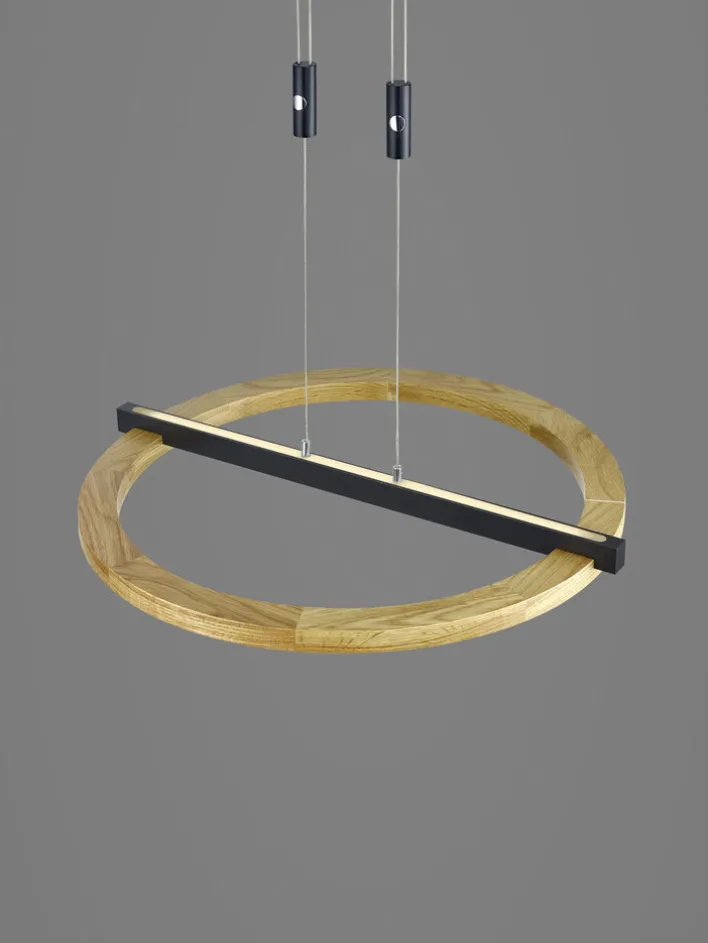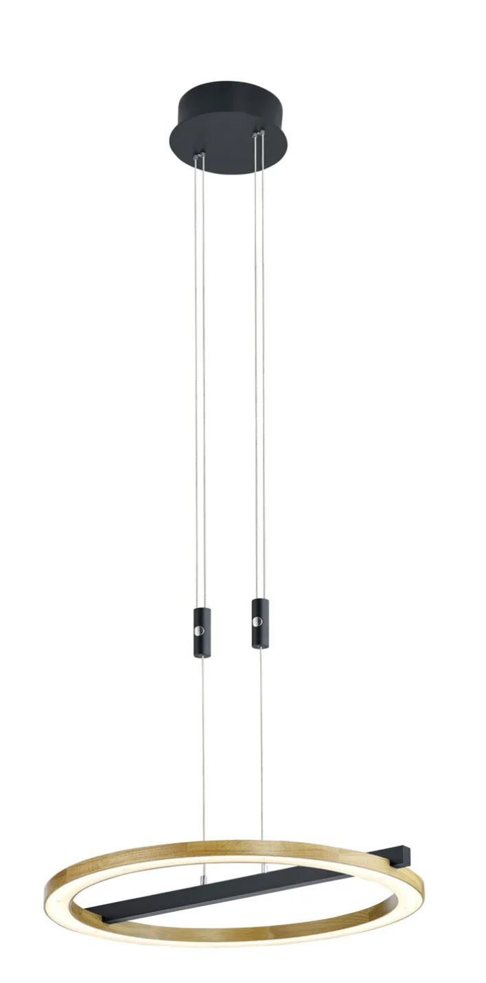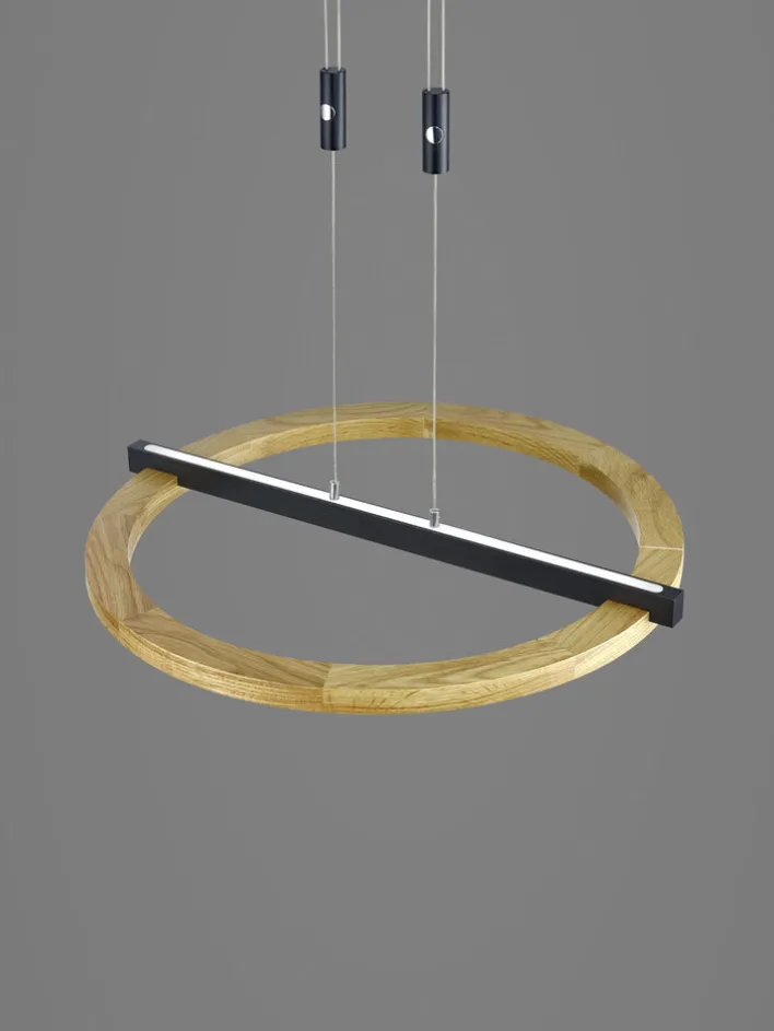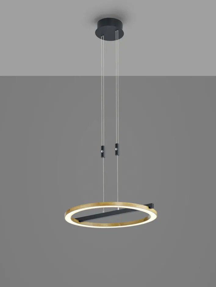 Die LED-Pendelleuchte NELLA vereint modernes Design mit funktionaler Beleuchtung. Mit einem Durchmesser von 50 cm und einer höhenverstellbaren Aufhängung von 50 bis 150 cm passt sie sich flexibel an verschiedene Raumhöhen an. Die Leuchte besteht aus einer Kombination von Holz und Metall, was ihr eine elegante und zugleich robuste Optik verleiht. Die Hauptfarben Braun und Schwarz harmonieren perfekt und fügen sich nahtlos in moderne Wohnkonzepte ein. Ausgestattet mit zwei fest eingebauten LED-Brennstellen bietet die Leuchte eine maximale Lichtleistung von 4.800 Lumen bei einem Energieverbrauch von 48 Watt. Die Lichtfarbe ist zwischen 3.000 und 6.000 Kelvin einstellbar, sodass sowohl warmes als auch kühles Licht möglich ist. Die Leuchte ist dimmbar und ermöglicht eine individuelle Anpassung der Helligkeit. Mit der Schutzklasse 1 und der Schutzart IP20 ist sie für den Innenbereich geeignet. Eine Fernbedienung ist im Lieferumfang enthalten.
