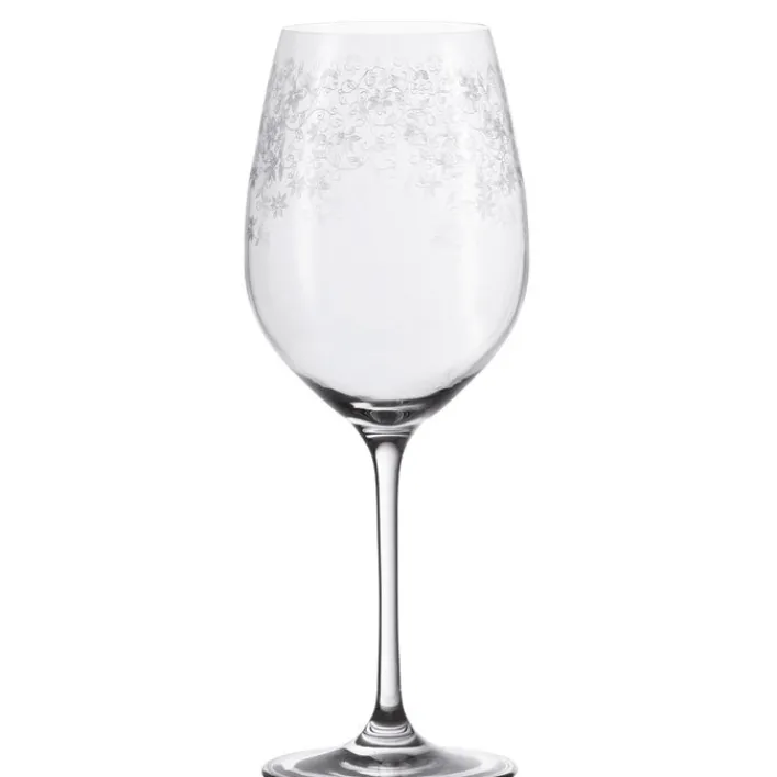 Die Gläser zeigen im oberen Bereich eine dezente florale Musterung, die als feines, matt gehaltenes Dekor gestaltet ist. Die Formgebung ist klassisch mit langem Stiel und großzügigem Kelch, passend zum Landhausstil. Das Set ist ideal geeignet für den Genuss von Rotwein und fügt sich harmonisch in verschiedene Wohnbereiche ein.