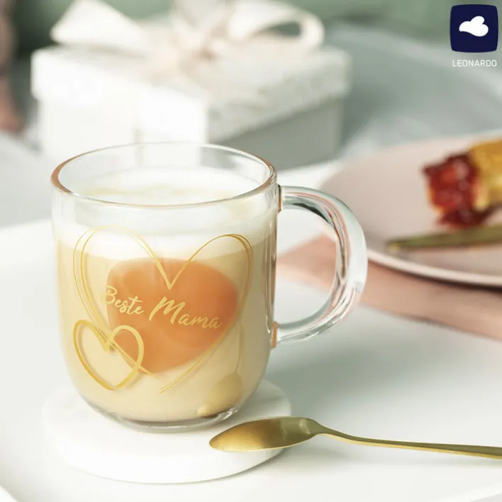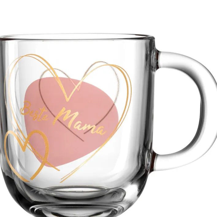 Mehrere Herzen in Gold- und Grauschrift sowie in unterschiedlichen Größen liegen übereinander und nebeneinander. Dazu gibt es einen großen rosafarbigen Fleck darunter sowie den Schriftzug BESTE MAMA in Goldschrift quer darüber. Dieses liebevoll gestaltete Design und die Größe der Tasse machen sie sicher schnell zur neuen Lieblingstasse. Zudem besitzt sie einen kräftigen Henkel, der ebenfalls aus transparentem Glas gefertigt ist. So liegt die Tasse gut in der Hand. Sie eignet sich bevorzugt für Kaffee oder Tee.