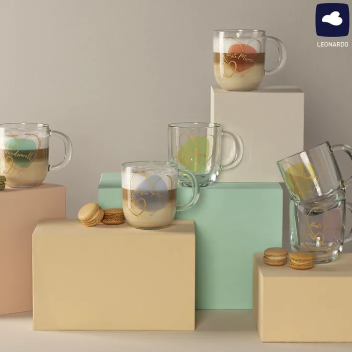 Die runde LEONARDO Tasse BESTE MAMA besteht vollständig aus transparentem Glas. Sie fasst 400 ml. Nach Gebrauch kann sie in die Spülmaschine gegeben werden.
